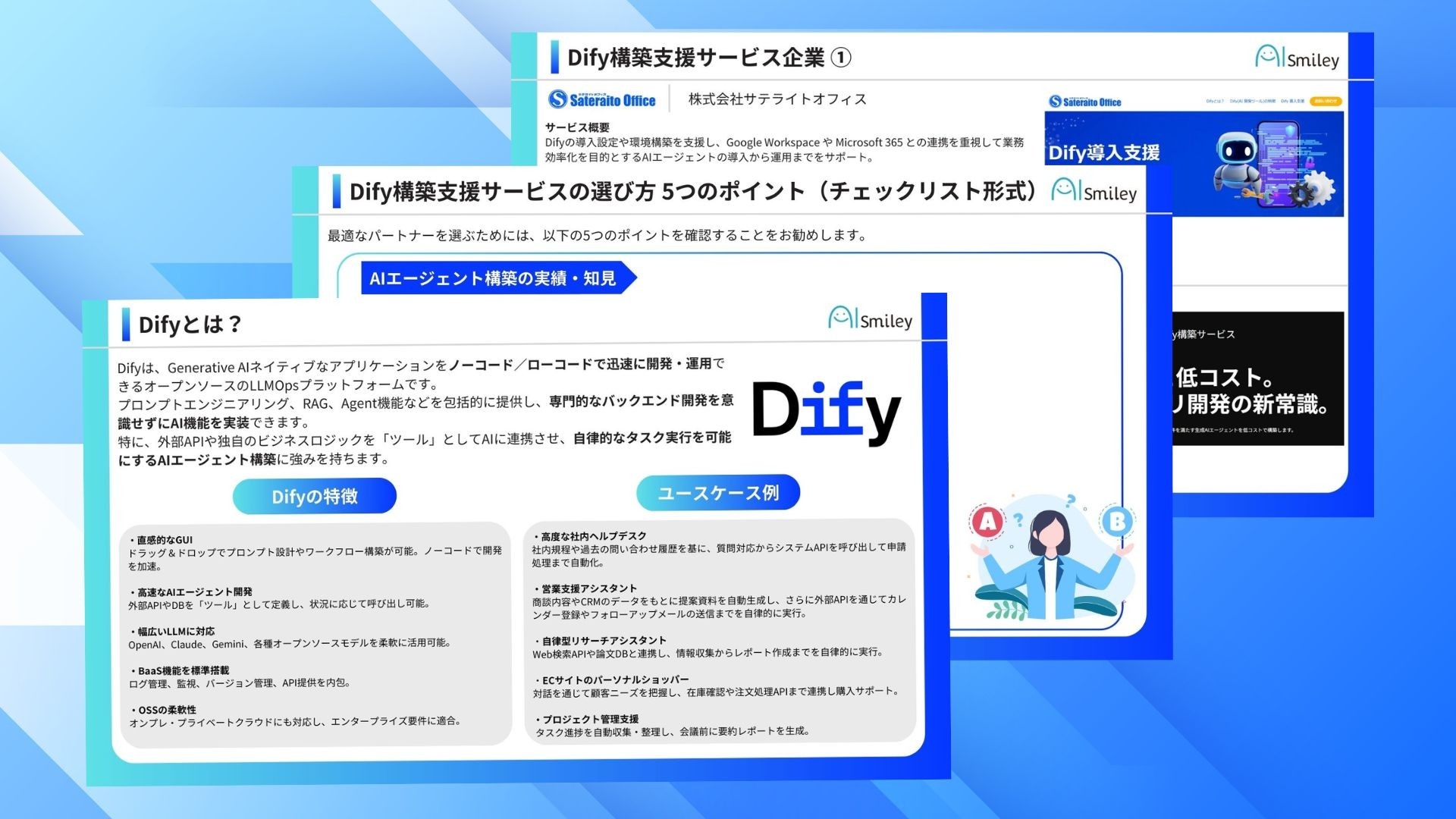 AIポータルメディア「AIsmiley」を運営する株式会社アイスマイリー(東京都渋谷区、代表取締役:板羽 晃司)は、Dify構築支援サービスの情報をまとめた「Dify構築支援サービス徹底比較ガイド」を、2025年9月24日(水)に公開しました。