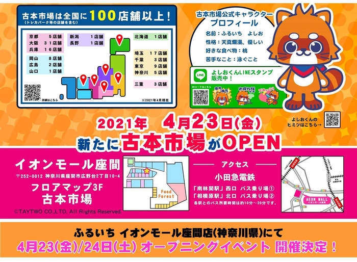 株式会社テイツー(本社:岡山県岡山市北区、代表取締役社長:藤原 克治)は、2021年4月23日(金)に『ふるいち イオンモール座間店(神奈川県)』を開店し、2021年4月23日(金)~24日(土)にオープニングイベントを開催いたします。