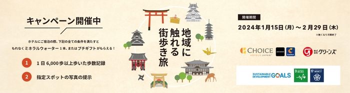 株式会社グリーンズ(本社:三重県四日市市、代表取締役社長:村木雄哉、証券コード:6547)は、2024年1月15日(月)から2月29日(木)までの期間、全国で運営する13ホテルにて、「街歩き旅」キャンペーンをスタートしました。このキャンペーンは、当社のホテルをお客様にご利用いただく際に、観光地や出張先でアクティブに楽しみながら健康習慣を身につけるきっかけとしていただくことを目的としています。