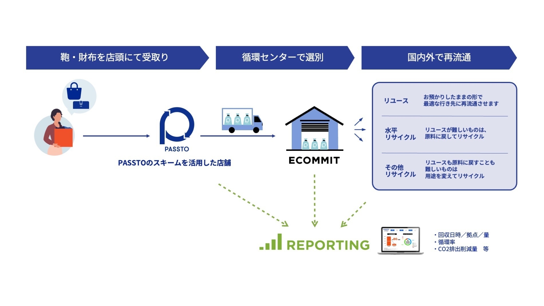 循環型社会に向けた不要品の回収・選別・再流通のインフラを構築する株式会社ECOMMIT(本社:鹿児島県薩摩川内市、代表取締役CEO:川野 輝之、以下「ECOMMIT」)と、株式会社サックスバーホールディングス(本社:東京都葛飾区、代表取締役社長:木山 剛史、以下「サックスバーHD」)は、環境負荷の軽減と資源循環への貢献を目的として、2025年1月15日(水)~31日(金)、関東エリアの30店舗にて、ECOMMITが提供する、不要品の回収・選別・再流通を一気通貫で行う資源循環サービス「PASSTO(パスト)」のスキームを活用した鞄・財布の店頭回収を開始します。バッグ業界においてPASSTOの導入は初の取り組みになります。