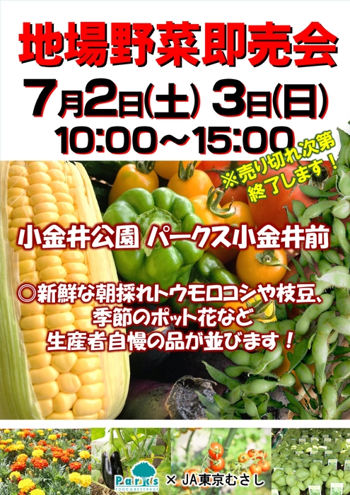 東京都公園協会が運営する光が丘公園内のパークス光が丘店・代々木公園内のパークス代々木の丘店・小金井公園内のパークス小金井店前において、地場野菜即売会(光が丘公園・小金井公園)、旬の地場野菜セット販売(代々木公園)を行います。
