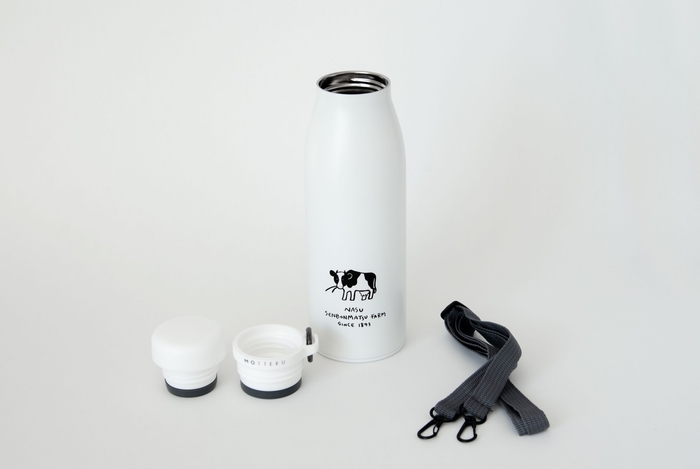 ”セボン”をワンポイントに、ミルク缶を彷彿させるデザインのサーモステンレスボトル。口も大きく洗いやすい。保温・保冷対応。持ち運びに便利なストラップ付き。