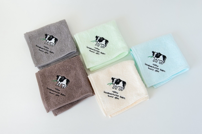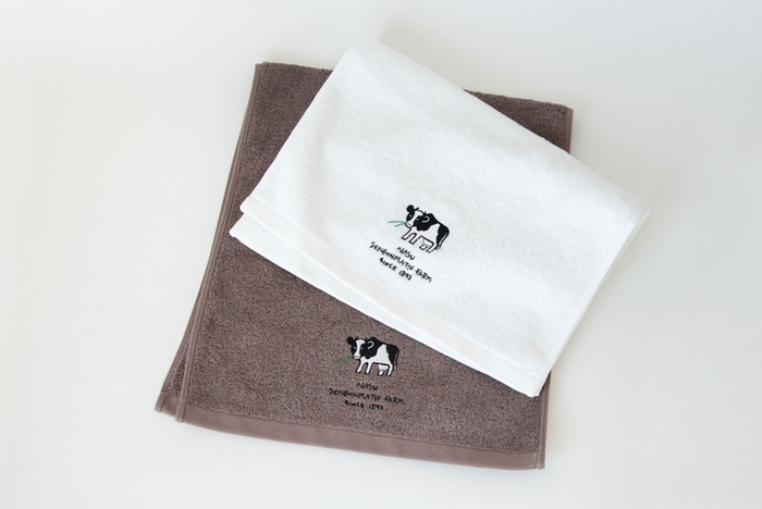 B.(画像左下)那須千本松牧場の放牧場で牛さんたちがくつろぐ様子をプリントしています。
