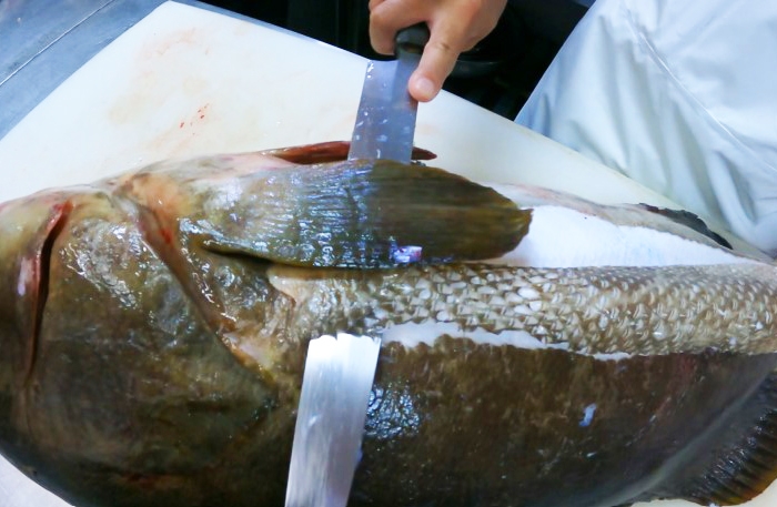 また、クエの巨大な頭と中骨、強靭なヒレの付け根はとても硬く、腹周りは高難度です。他の魚のように三枚に下ろしますが、骨がひときわ硬く、出刃包丁で骨を断ち切るのは容易くはありません。大型など場合によっては、数人がかりでさばき、ノコギリを使います。