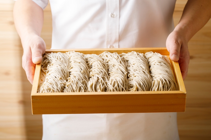 店内には製麺機やそば打ちの工程が見えるスペースを設置。また、オープンキッチンでは調理の様子を間近で楽しめ、そばの香ばしい香りや調理音が五感を刺激する臨場感あふれる空間となっています。