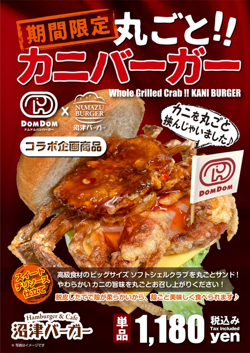 ソフトシェルクラブ1匹をサンドした、豪華極まりない『丸ごとカニバーガー』は、発売開始から各メディアでも取り上げられた「ドムドムハンバーガー」の”超”人気商品。昨年秋、沼津バーガーで期間限定販売し、予想を超える販売実績となり、ご好評につき今回再販が決定致しました。