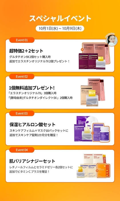 スペシャルイベント③ メガポ限定!「スキンケアフィルム」&「マスク10パック」セット購入時、追加で「スキンケア錠剤」1か月分を1個無料プレゼント!