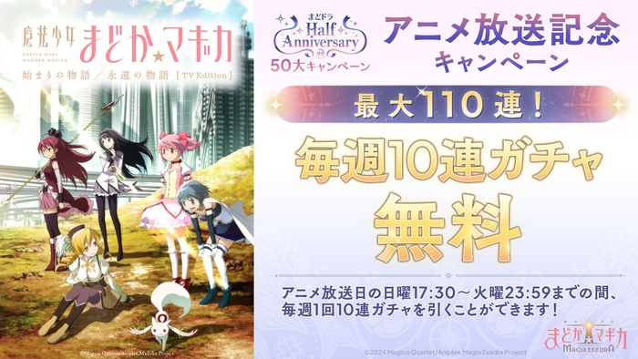 10月12日(日)より、「魔法少女まどか☆マギカ 始まりの物語/永遠の物語」TV Edition 放送開始を記念し、毎週アニメ放送後の夕方5時半より、10連ガチャを開催いたします。無料ガチャが引けるのは、日曜日の夕方5時半から3日間で、翌々日の火曜23:59までとなり、アニメ放送期間中に最大で110連ガチャを無料で引くことができます。