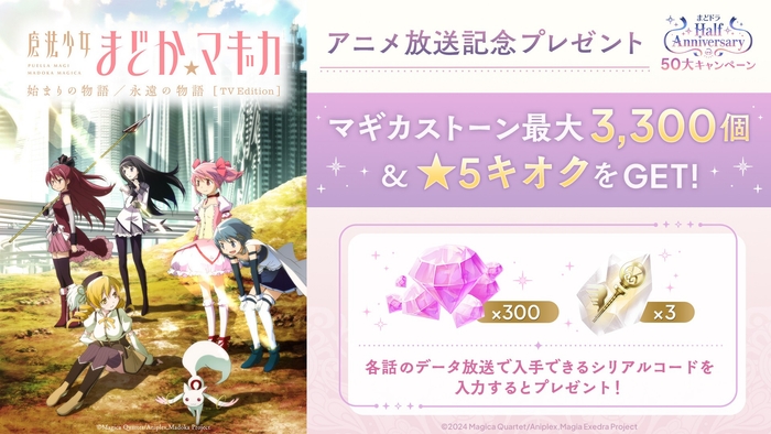 各話ごとにシリアルコードが手に入りますので、ゲーム内またはまどドラ公式サイトからシリアルコードを入力することで、期間中合計でマギカストーン最大3,300個、★5キオク確定マギアキーのかけら最大33個を獲得いただけます。