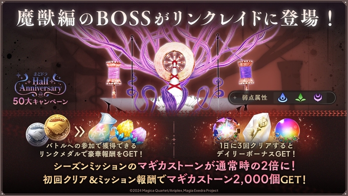 初回クリア報酬に加え、ハーフアニバーサリーを記念して、シーズンミッションが通常時の2倍に増加しております。これにより、初回クリア報酬とミッションクリア報酬の合計でマギカストーン2,000個を獲得いただけます。