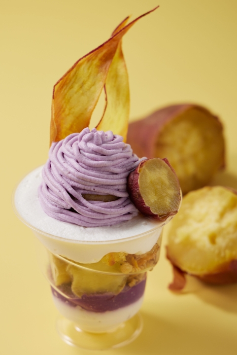 モンブラン、焼き芋、チップス、カステラとさつま芋尽くしのミニパフェ。色々な味わいと食感も楽しい。お食後に紅茶と合わせてお楽しみください。