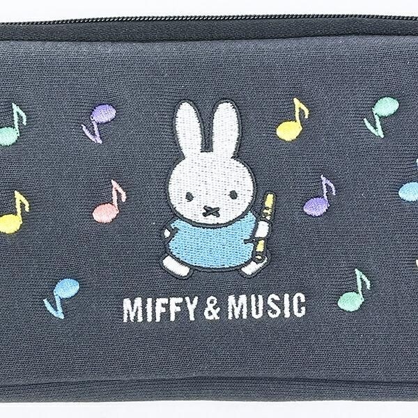 MIFFY&MUSICシリーズのペンケース。たくさんの音符と、笛をもつミッフィーちゃん。今にも音楽が聞こえてきそうなデザインです。