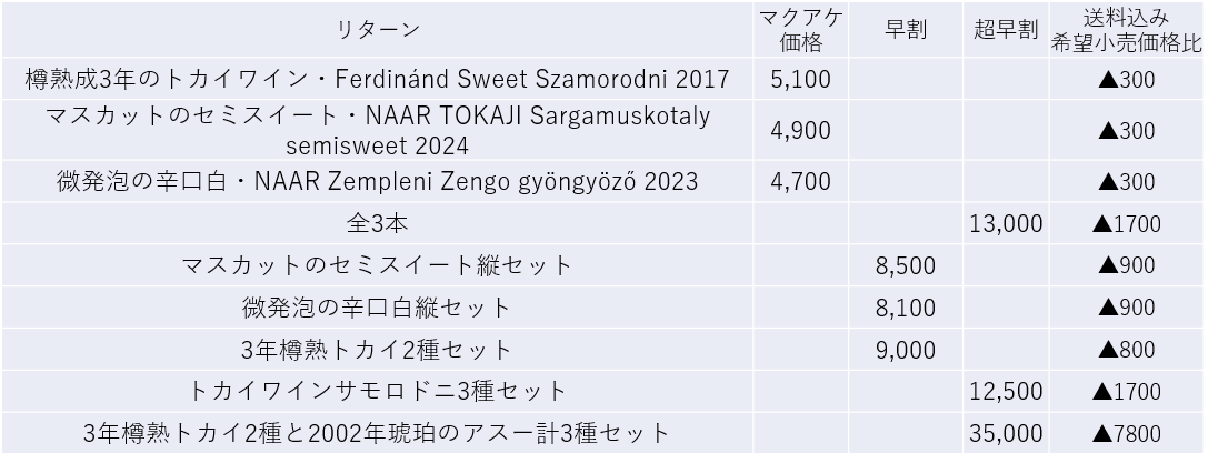 また、特別に2002年ヴィンテージの琥珀色のトカイアスー(写真右)をセットに入れたリターンも作っています。このトカイアスーは弊社の旗艦商品です。割安な価格設定にしておりますので、トカイワイン好き、貴腐ワイン好きの方はぜひお試しください。