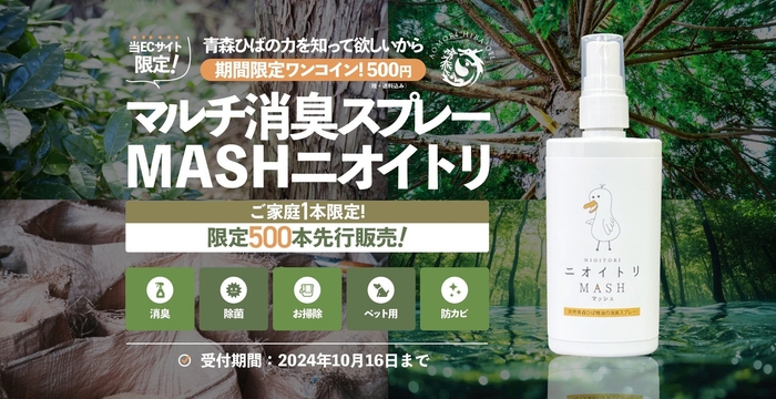 青森ひば精油を使った生活用品の企画・製造・販売を行う株式会社tappi.lab(本社:神奈川県川崎市、代表取締役:園田 孝一、以下当社)は2024年10月10日より添加物を使わずに青森ひば精油と水を乳化させ消臭・防カビ・除菌・などマルチに使えるスプレー”ニオイトリMASH”を500本限定で500円で販売致します。