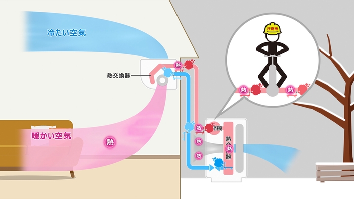 エアコンの室内機と室外機の中には、熱を空気の中から集めたり、空気中に逃がしたりする「熱交換器」が入っています。そして、パイプの中には、熱を運ぶ「冷媒(れいばい)」というガスが循環しています。まず室外機は屋外の空気を吸い込み、空気中の熱を熱交換機で集めます。集めた熱は冷媒が受け取り、室内機へ運ばれ、温風として送り出されます。