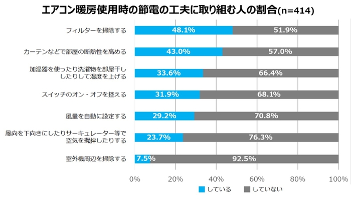 また、全体の半数以上が、エアコンのフィルター掃除や室外機周辺の整理整頓など、エアコンの基本的な節電に取り組んでいないことも明らかとなりました。今回の調査では、加湿や空気の攪拌など「設定温度を上げる前にできる節電の工夫」だけでなく、「エアコンの基本的な節電方法」を知らない人が多い可能性もうかがえる結果となりました。