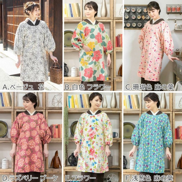 バリエーション豊富でお洋服にもぴったりの柄割烹着