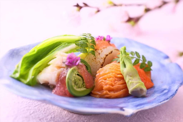 暦を取り入れて仕立てた料理を、星のや京都での滞在中に見た風景と重ねることにより、平安貴族が愛でた四季の自然に抱かれ過ごすという世界観に没入していきます。二十四節気の清明(せいめい)*2は、花が咲き、空は青く澄み渡り、爽やかな風が吹く頃です。先付では、旬の3種の貝に春の山菜を合わせ、梅肉ジュレをかけることにより、青空の下で花が開くような爽やかで色鮮やかな風景を表現しています。