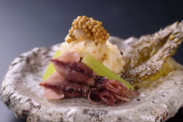 しっとりとした食感の鯛は煎った唐墨と合わせ、さらにうまみを引き出しました。脂乗りの良い穴子は焼霜仕立てにし、完全に火を通さないことで柔らかい食感が楽しめます。キャビアと合わせて食べることで、さらに穴子の甘みが引き立ちます。