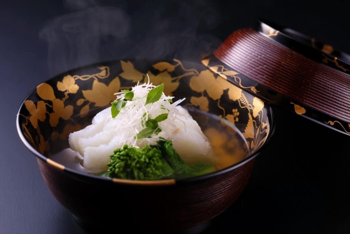 嵐峡の滋味豊かな料理は、身も心も安らぎます。例えば、椀物のお出汁は、季節に合わせて身も心も悦ぶ味に仕上げています。暑い夏の出汁はすっきりとした印象の味わい、寒い冬の出汁はほっと安心するような昆布の深いうまみが感じられる味わいです。昆布と鰹節を厳選し、水の温度や漬ける時間を季節に合わせて細かく調整することで、伝統に裏付けされたうまみを引き出しています。