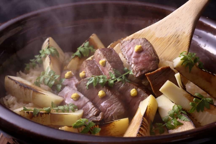 筍の香りと甘みが楽しめる御飯です。上に乗せた筍に加え、角切りにした筍を御飯に炊き込むことにより、より食感を楽しめるように仕立てています。炭火で焼き上げた牛フィレ肉と、木の芽の香りとともに味わいます。