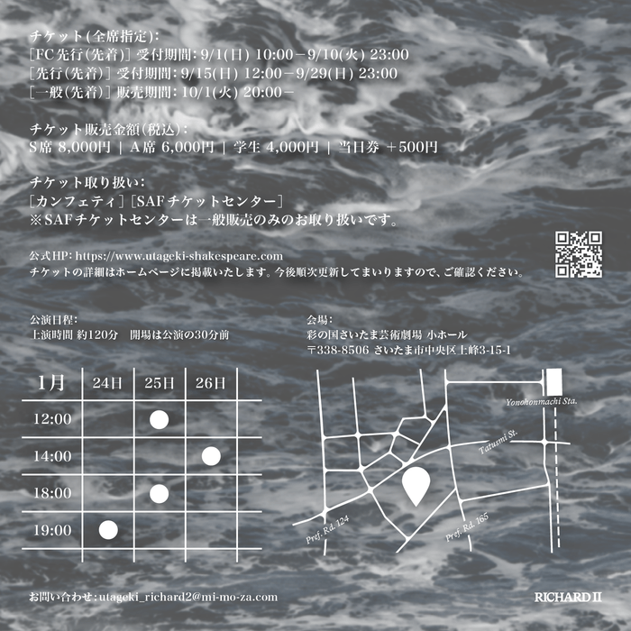public history主催、歌劇『リチャード二世』が2025年1月24日(金)〜26日(日)に彩の国さいたま 芸術劇場 小ホール(さいたま市 中央区 上峰3 -1 5 -1)にて上演されます。 チケットはカンフェティ(運営:ロングランプランニング株式会社、東京都新宿区、代表取締役:榑松 大剛)にて発売予定です。