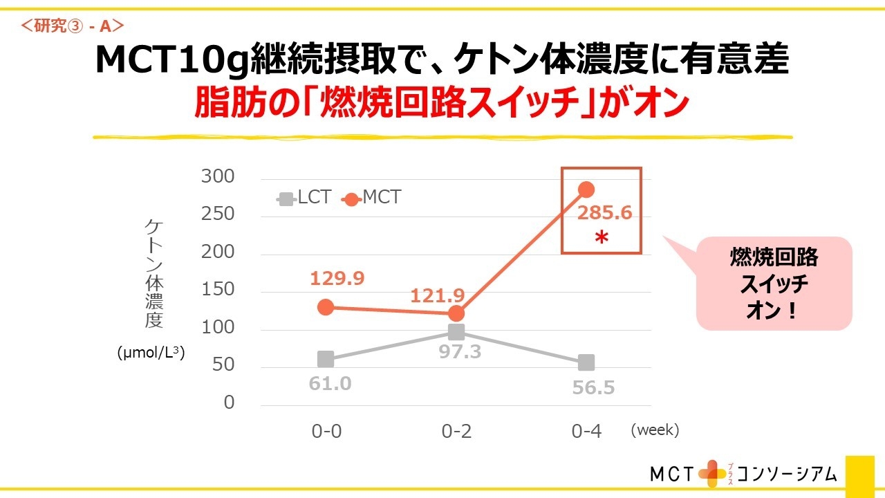 今年1月に当コンソーシアムにて、糖質を含むPFCバランス(P=たんぱく質、F=脂質、C=糖質)の整った普段の食事に加え、MCTを摂取するヒト試験を行いました。MCT10g群ではLCT(長鎖脂肪酸:Long Chain Triglyceride)に比べ、4週目でケトン体濃度に有意差を確認しました。脂肪が燃焼しやすい体質になったのではないかと考えられます。