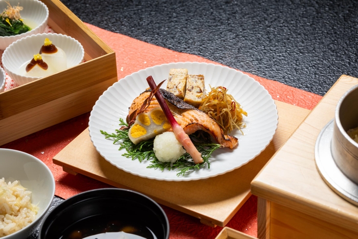 朝食は、「山田錦」や「雄町」、「愛山」など、日本酒造りに使用される酒米を炊いたご飯に、酒粕で漬けた旬の魚や、甘酒を使用したデザートを添えて提供します。