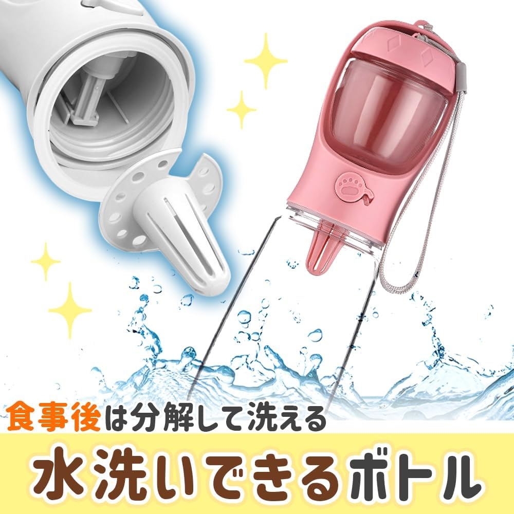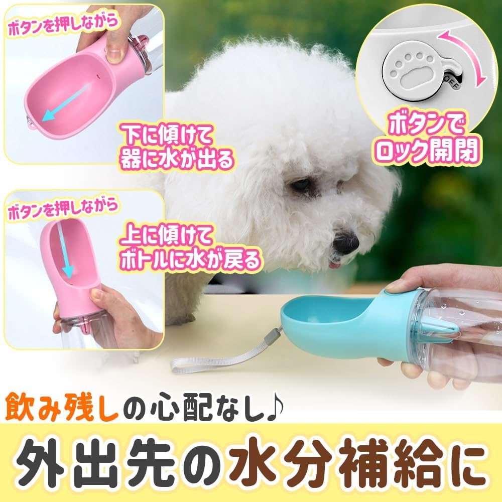 このウォーターボトルは、ペットが必要とする水分をいつでもどこでも簡単に補給できるように設計されています。散歩時だけでなく、ドッグランやペットとの旅行時も、このウォーターボトルがあれば、水分不足を気にすることなく、安心して外出できます。