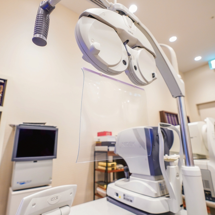 スタッフとお客様との距離が近くなる視力測定器には飛散防止シートを設置しています。