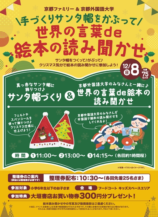 京都外国語大学(京都市右京区、学長:小野隆啓 以下 本学)は、地域の皆様に感謝を込めて、親子で楽しめる特別なイベント「サンタ帽づくり&世界の言葉de絵本の読み聞かせイベント」を京都ファミリーと共催します。本学ならではの多文化・多言語体験プログラムを実施予定ですので、ぜひご参加ください。