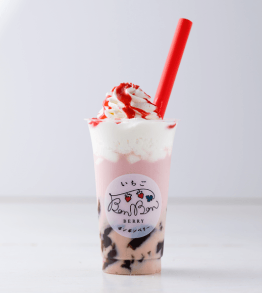 もちぷる食感の黒糖わらび餅入りのいちごミルク。たっぷりホイップとベリーソースをのせて、デザート感覚で楽しめるスイーツドリンクです。