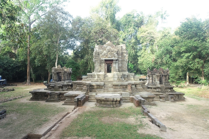 奈文研は以来カンボジアとの共同事業を継続し、現在はアンコール遺跡群内の西トップ遺跡において調査修復事業を続けています。南祠堂、北祠堂、中央祠堂と調査修復作業を展開し、ついに西トップ遺跡の3祠堂の修復作業が完了しました(写真1)。まだ中央祠堂正面に位置する仏教テラスの修復が残っていますが、大きな区切りとなりました。