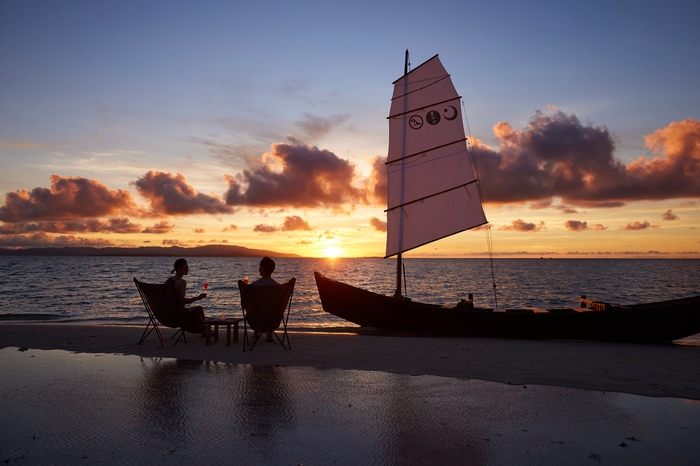 各施設が独創的なテーマで、圧倒的非日常を提供する「星のや」。沖縄県・竹富島にある滞在型リゾート「星のや竹富島」は、2023年3月1日から5月31日まで、海に浮かんでいるような砂浜で大切な人と夕刻の絶景を眺める「いりばな*1の思い出」を実施します。沖縄の伝統的な木造船「サバニ」に乗り、空と海が夕焼け色に染まる幻想的な景色に包まれます。今期は新たに、夕日が地平線に沈む間際で、夕焼けが最も色濃く美しく見える時間に干潮時にのみ現れる砂浜(サンドバー)に上陸し、カクテルを楽しむ時間を設けました。一層強く記憶に残るような瞬間を過ごせます。刻々と移り変わる空の色を海の上で眺めた後は、星のや竹富島でディナーを味わい、大切な人と過ごす時間を満喫します。