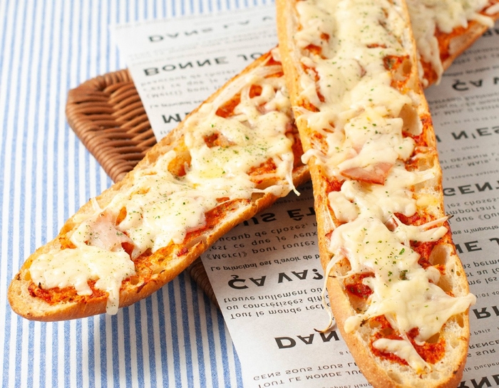 商品特徴:長~いバゲットを縦割にしてベーコン・オニオン・チーズで焼き上げた超ロングピザ!