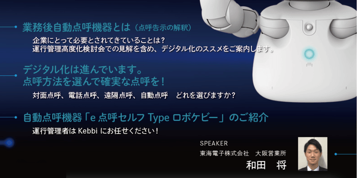 ■詳細はこちらから:ロボットが運行管理者になります!e点呼セルフTypeロボケビー新製品発表セミナー