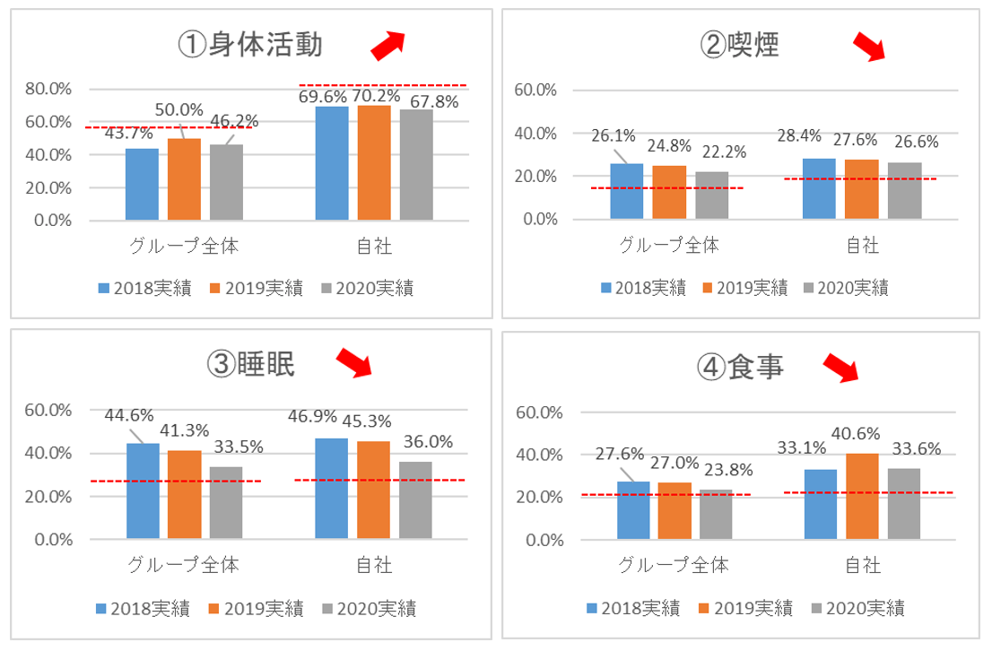 当社は、コニカミノルタ健康保険組合(以下、健保組合)と連携して、生活習慣病の予防やワークライフバランスの充実など各種健康課題に対する健康増進策に積極的に取り組み、二次健診受診率の向上や労働時間の削減などの成果をあげています。当社及びコニカミノルタグループは、今後も従業員の健康維持増進を経営の視点から推進し、豊かな社会の実現に貢献することを通じて、企業としての社会的責任を果たしてまいります。