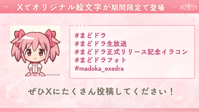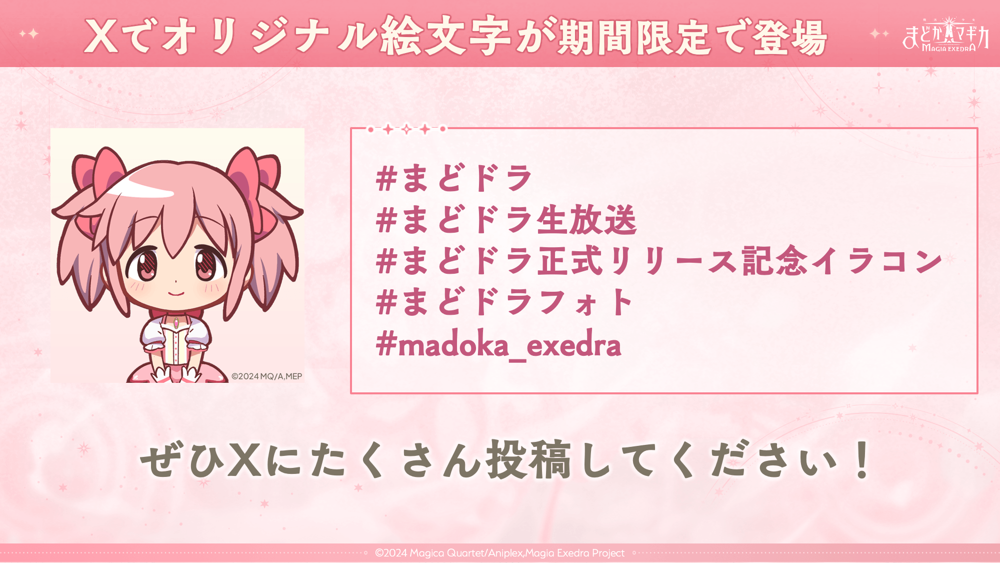 X(旧:Twitter)で「魔法少女まどか☆マギカ Magia Exedra」の関連ハッシュタグをつけてポストすると「鹿目まどか」の絵文字が期間限定で登場いたします!