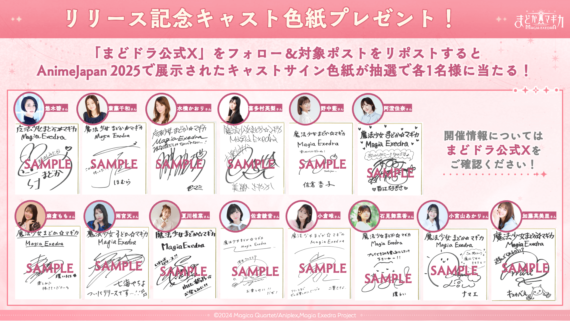 2025年3月22日(土)・23日(日)東京ビッグサイトで開催されたAnimeJapan2025「魔法少女まどか☆マギカ」ブースにて展示されていたキャスト陣のサイン色紙をプレゼントいたします!