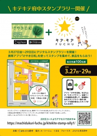 府中駅周辺を中心に、お店やイベントなどの情報が簡単に手に入る街歩きアプリ「けやき日和」をスマートフォンにダウンロードし、各商業施設に掲示している2次元コードを読み取るデジタルスタンプラリーを開催します。4つの商業施設全てを巡ると景品プレゼント!