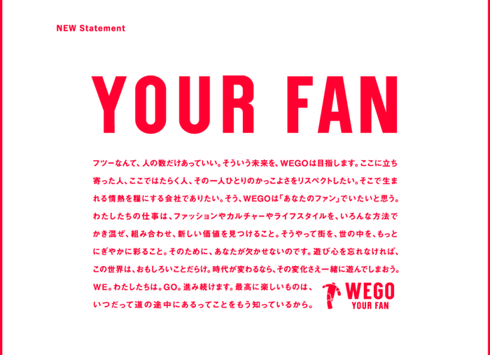 2020年、めざすのは“YOUR FAN(あなたのファン)であり続けること”と、ブランドコンセプトを新しく変化させる「WEGO」 【株式会社ウィゴー/ WEGO CO., LTD.:本社 東京都渋谷区/代表取締役:園田 恭輔】。