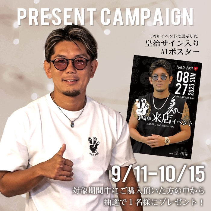 上記期間中にMADBRO公式でご購入いただいた方の中から抽選で1名様に、「皇治サイン入りポスター」をプレゼント!