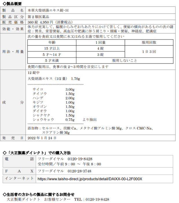 当社は2020年12月に、「本草八味地黄丸料エキス錠-H」「本草ヨクイニン錠S」「テイシ防風通聖散」の3つの漢方・生薬製剤を「大正製薬ダイレクト」で発売し、ご愛顧いただいております。今回「本草大柴胡湯エキス錠-H」がラインアップに加わったことで、より多様なお悩みに対応できるようになりました。今後も生活者の皆様の様々なお悩みに寄り添えるよう、より一層努めてまいります。