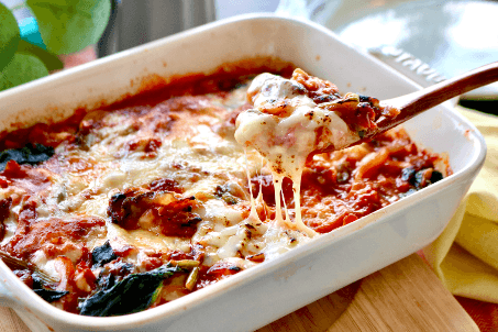 ④ほうれん草を加えさっと混ぜ、耐熱皿に入れ、ピザ用チーズをかけたらトースター(1000~1200W)やオーブン(250℃)で10分程度、チーズが香ばしく色づくまで焼く。