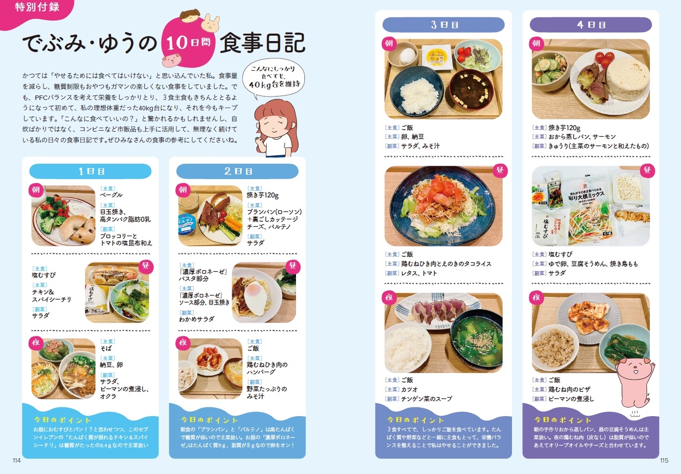 さらに、ゆうさんの毎日の食事日記を10日分、写真とともに紹介。「ダイエット中なのに、こんなにしっかり食べていいの?」「これだけ食べているのに40kg台をキープしているの?」と食事への考え方も大きく変わるリアルな食事例も必見です。