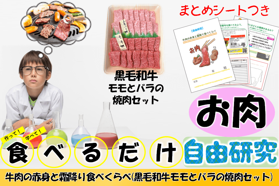 商品詳細:黒毛和牛モモ焼き肉用200g、黒毛和牛三角バラ焼肉用200g、自由研究まとめシート付き