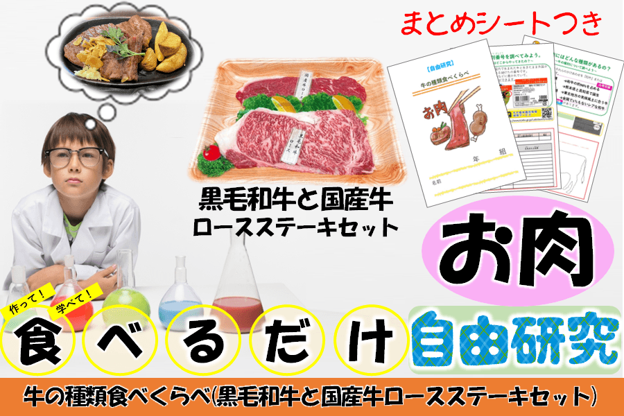 商品詳細:黒毛和牛ロースステーキ1枚(180g)、国産牛ロースステーキ1枚(180g)、自由研究まとめシート