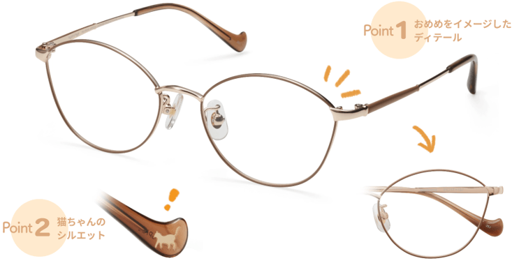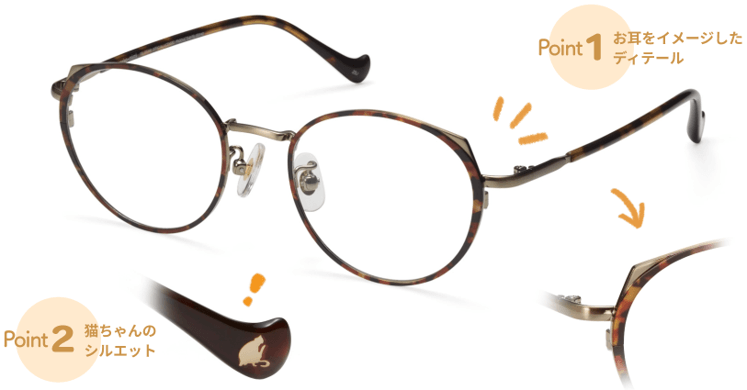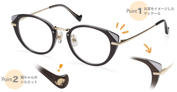 プラスチックのフロントパーツに段落ちカットを入れることで、猫のかわいらしい耳をイメージしたフレーム。つるの先にはのんびり毛づくろいをしている猫のシルエットが埋め込まれています。