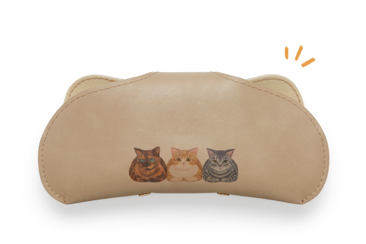 専用ケースとメガネ拭きを付属しており、ケースの表面には足跡、背面にはメインビジュアルに使用している香箱座りの猫をプリントし、猫耳が立ったようなシルエットにしています。