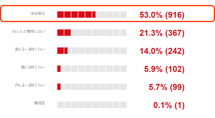ほぼ毎日=53.0% 週1回以上着用するのは72.9%